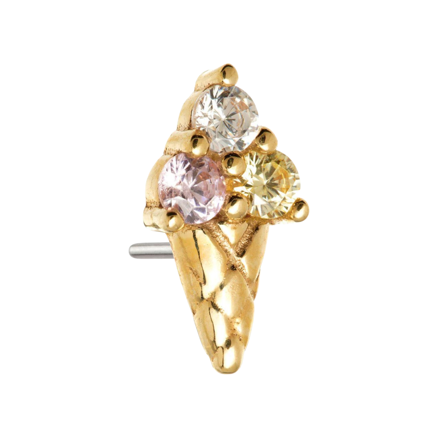 TL — Jewelled Ice Cream Attachment: whimsical cone motif with CZ accents for a fun pop of sparkle. Details: size 7 mm; suitable for initial piercing.