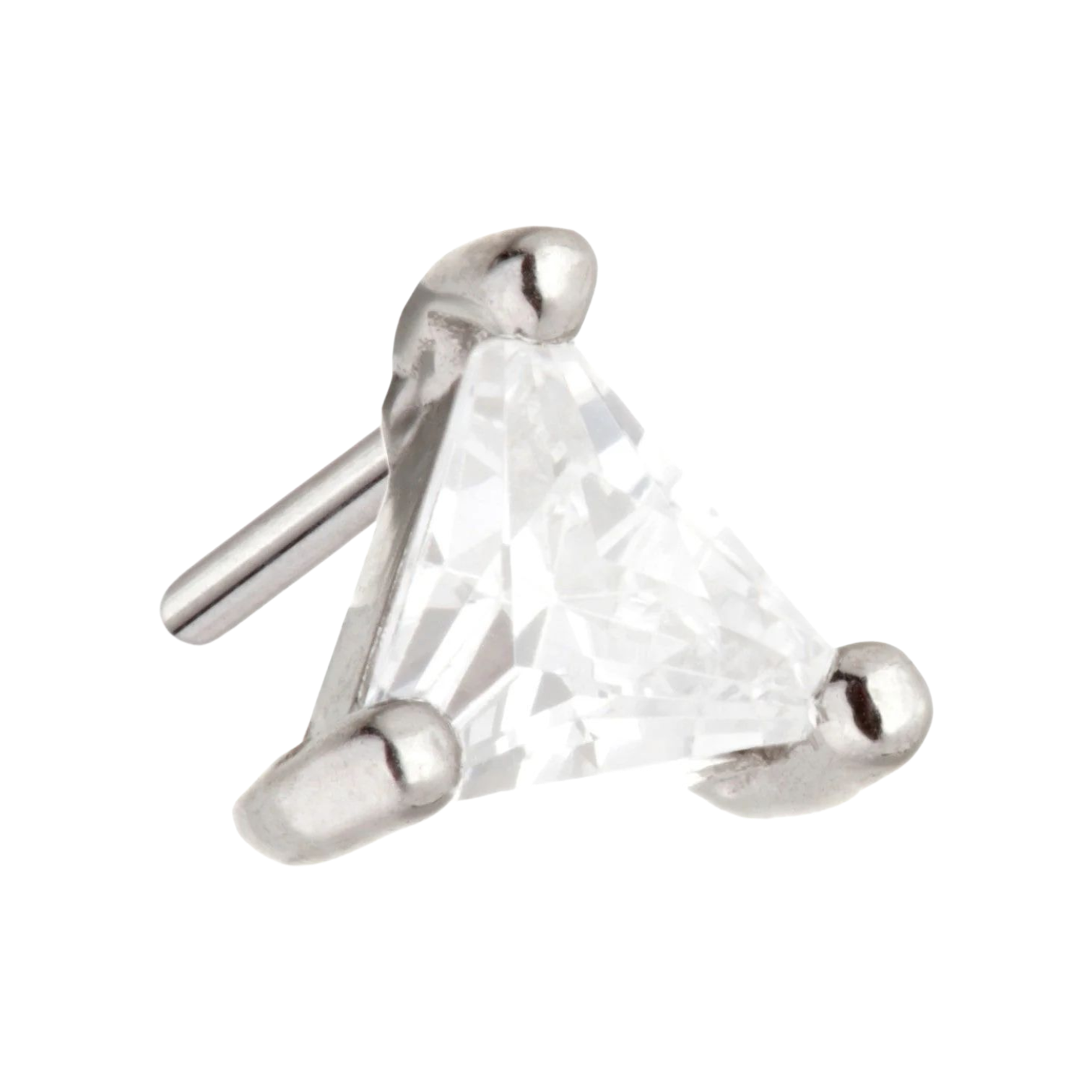 TL — Gem Triangle Pin Attachment: minimalist triangle with crystal centre; attachment size 3 mm; 316L surgical steel pin; suitable for initial piercing.